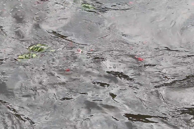 Conceiving a tasty and sensual vocabulary, the film footage around you creates a setting and oscillates between excerpts from the Brazilian pornochanchada film 'Contos Eróticos' (1977) and Zamora’s own footage of a woman disposing a watermelon from a busy viaduct in São Paulo.