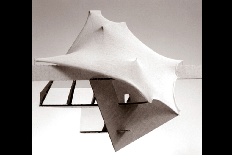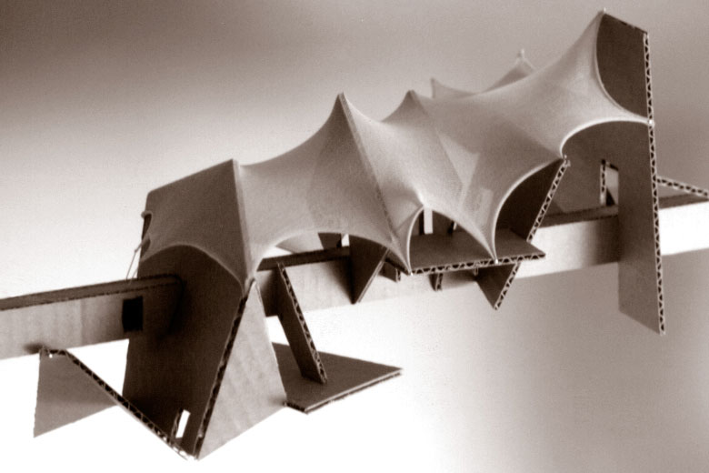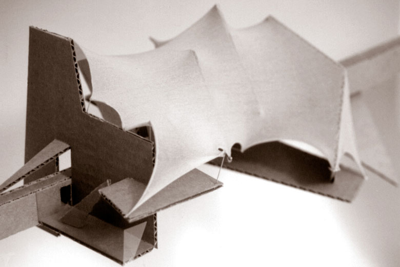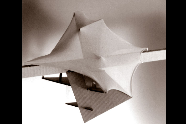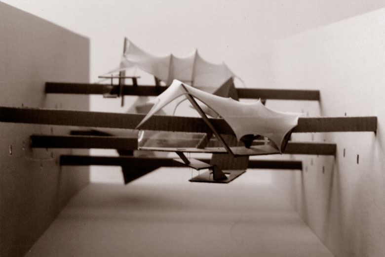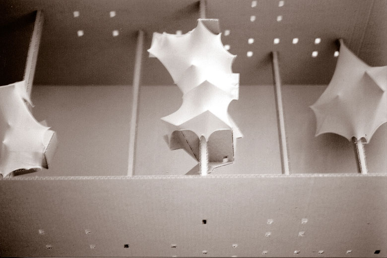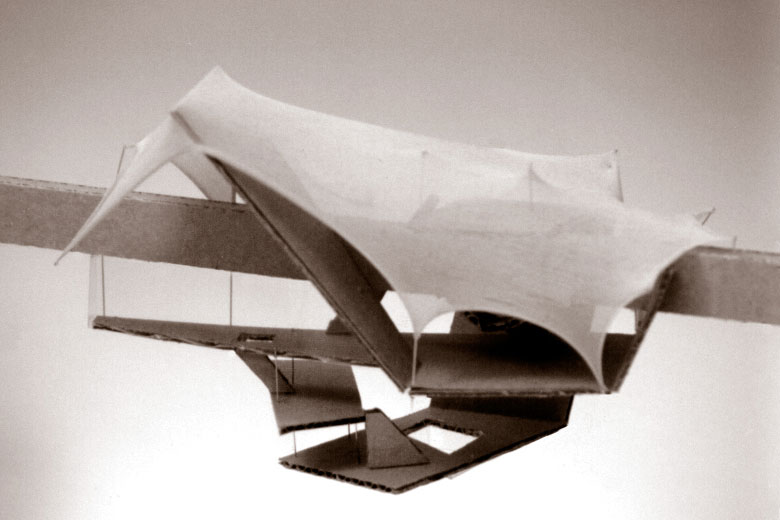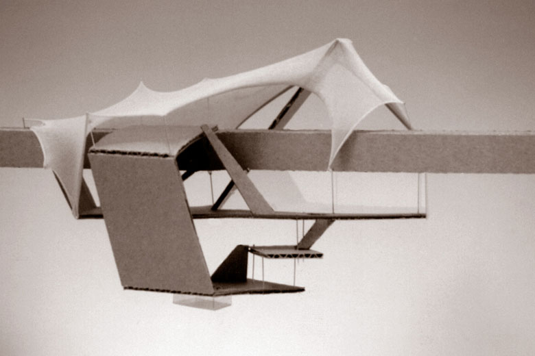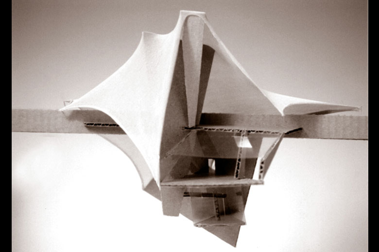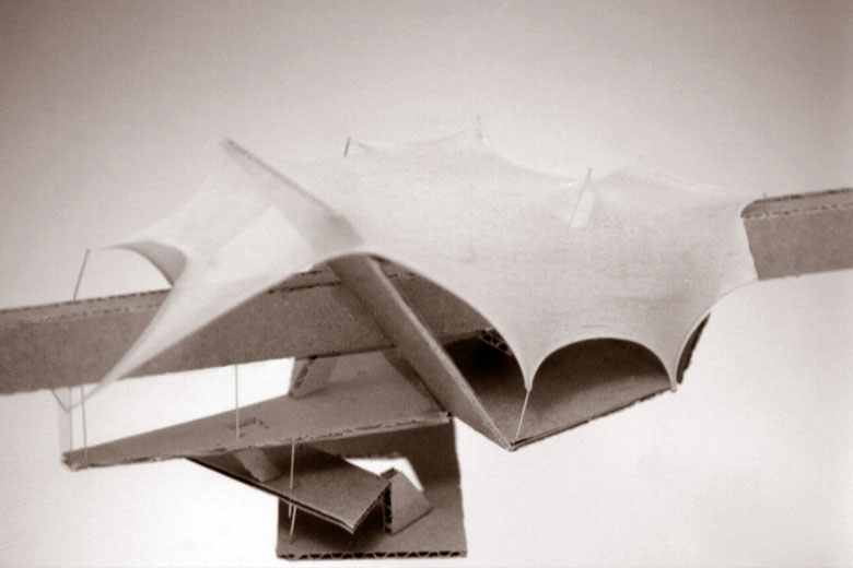This aggressiveness with which the organic form grows into rigid structures in order to finally impose itself, is its right: the right of poetry, like a concrete necessity of architecture, of the city, of everything. It is fragile poetry, which nevertheless never lets go of realism (5 columns, 7 anchoring places, 3 bedrooms). Finally, it balances and harmonizes that which is unilaterally opposite. In the translation of original language to the language of design, the organic is converted into content and it comes through intact. At the same time the organic form is converted gradually and literally into organic structure.