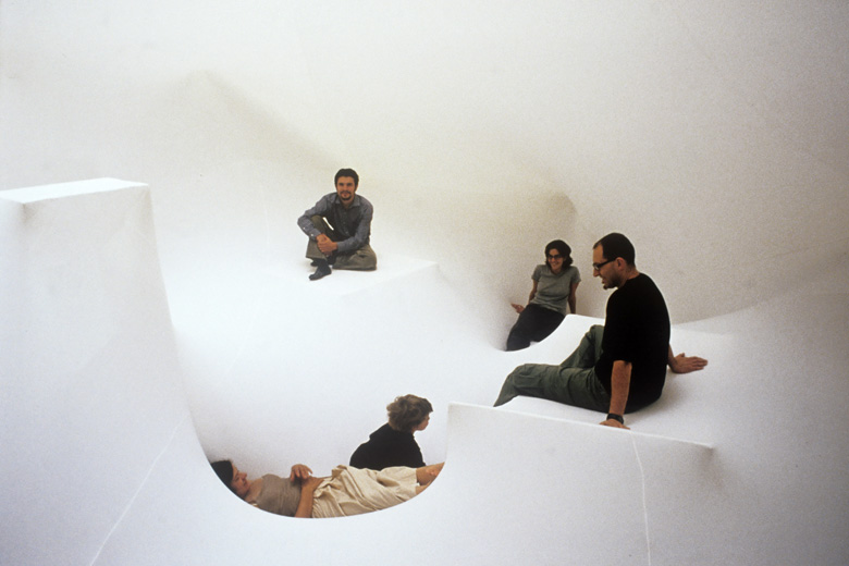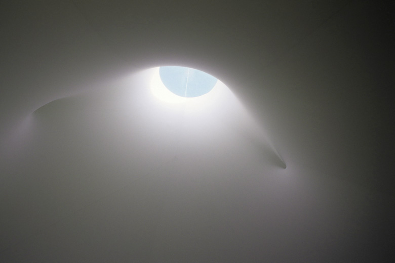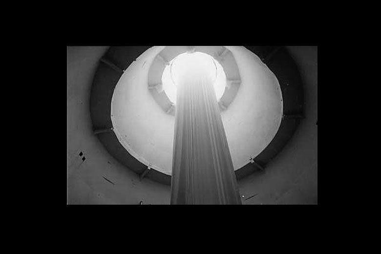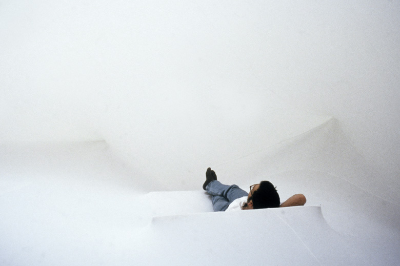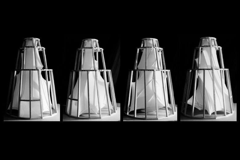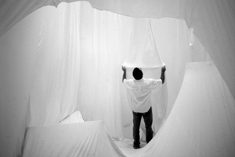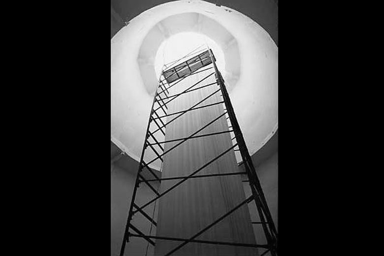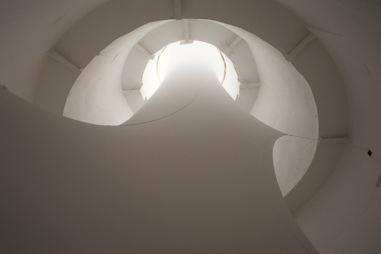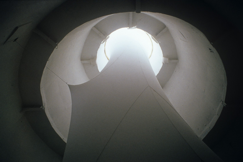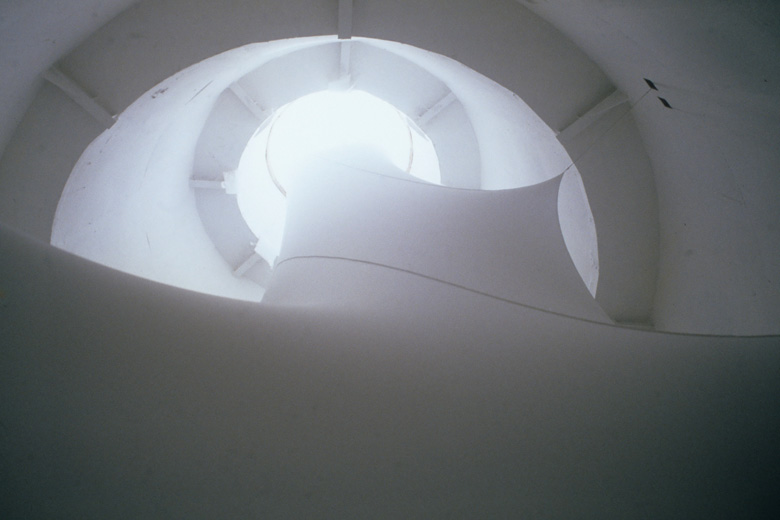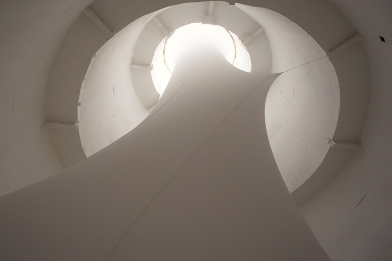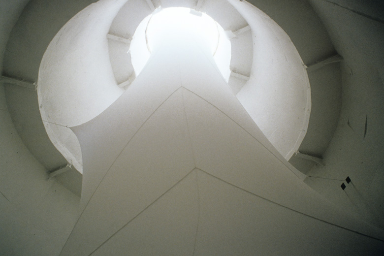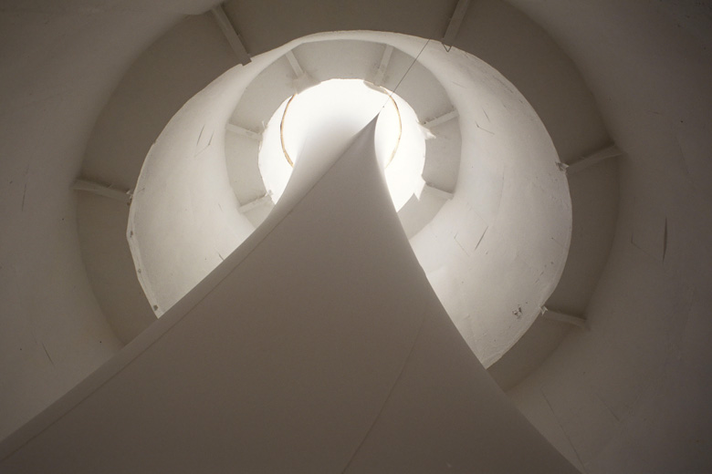 Intervention that fully occupies the interior of the tower, transforming this space in an organic environment, the light shed on the plastic membrane that covers this interior provokes a transfiguration that ends up dissolving the surroundings and the limits of this space.